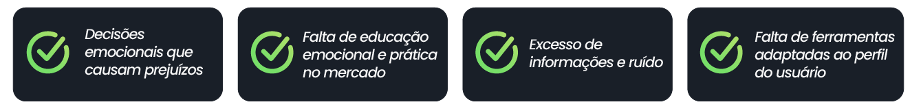 Ela busca reduzir a perda de capital causada por decisões emocionais e pela sobrecarga de informações, entregando uma plataforma inteligente e adaptável a qualquer perfil de investidor.