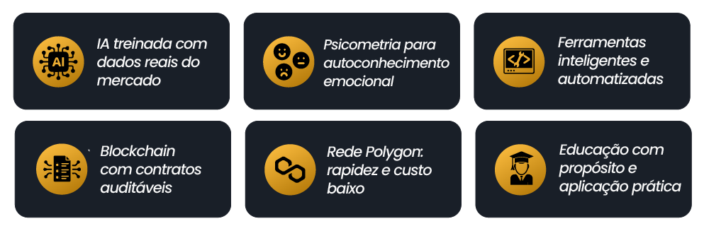 Combinamos Inteligência Artificial, psicometria e Web3 para entregar uma solução única, centrada no usuário e adaptada ao seu perfil emocional.